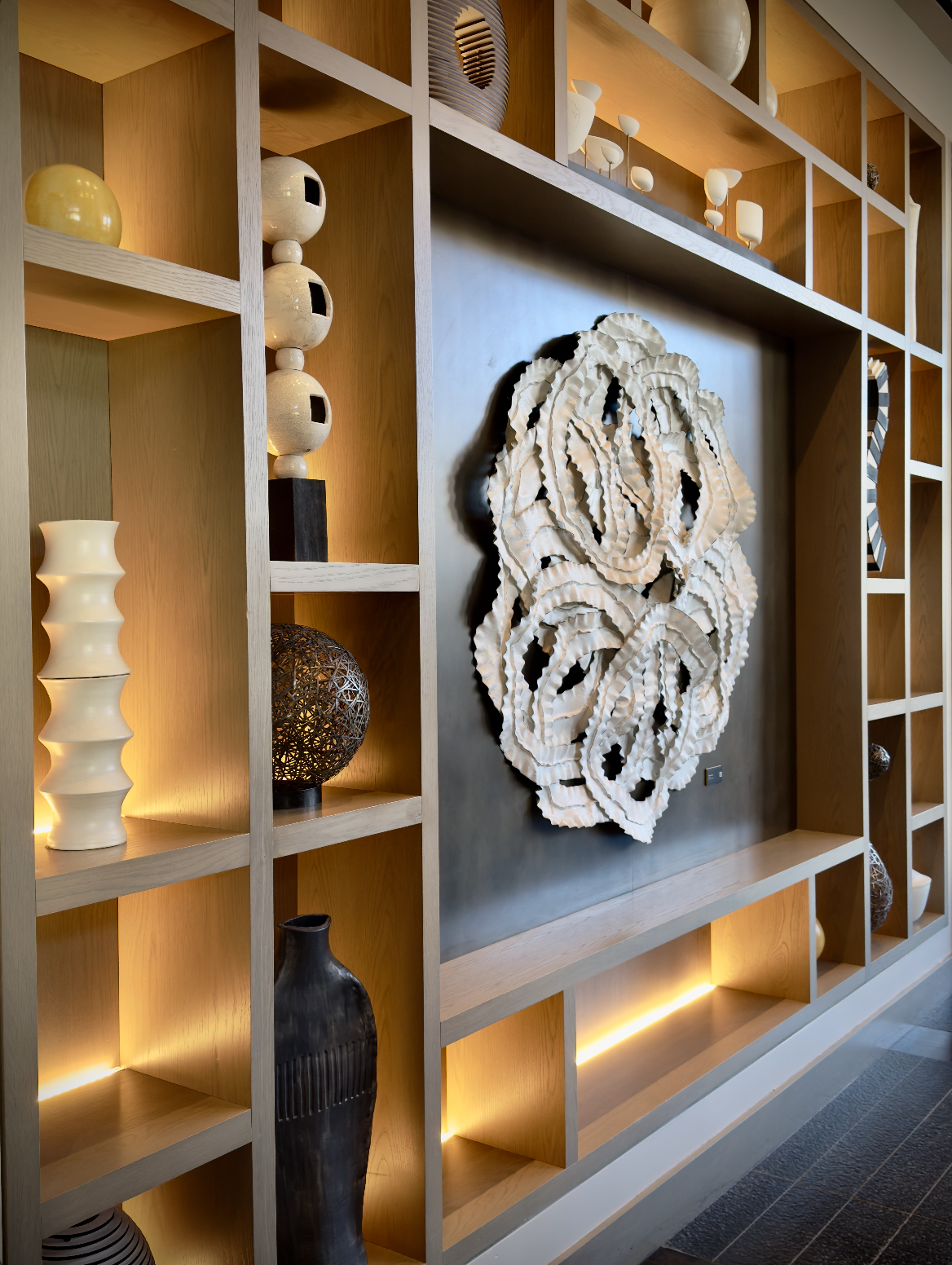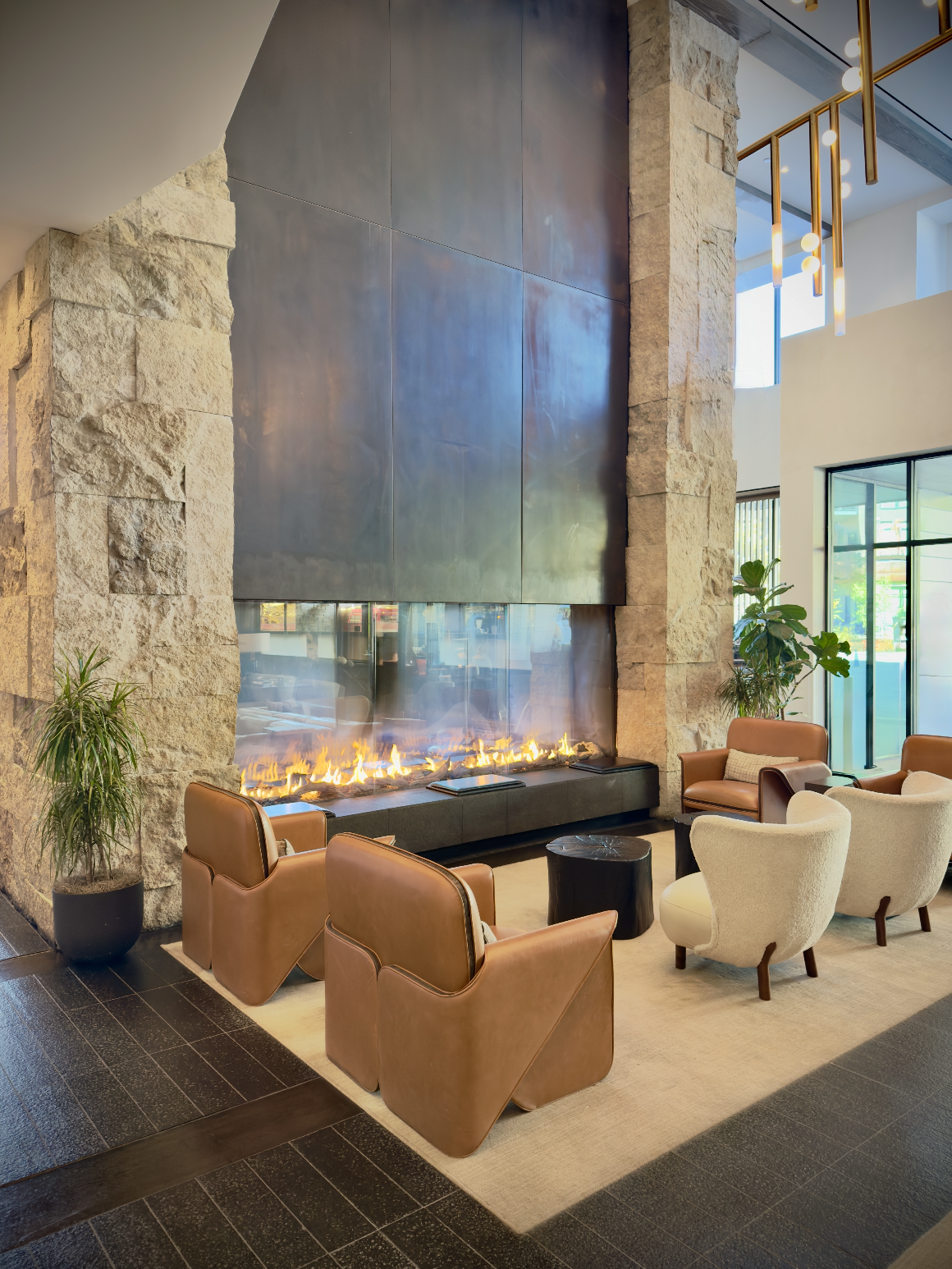 The hotel’s exterior, a beautiful blend of stone, wood, and glass, immediately sets the tone. Its design effortlessly balances the rustic beauty of the area with sleek, contemporary lines. As we entered the lobby, we were greeted by the scent of rich wood, warm leather, and the soft hum of an open fire crackling in the background. The decor was both chic and cozy, with oversized armchairs, deep mahogany paneling, and abstract mountain artwork that somehow felt both modern and timeless.