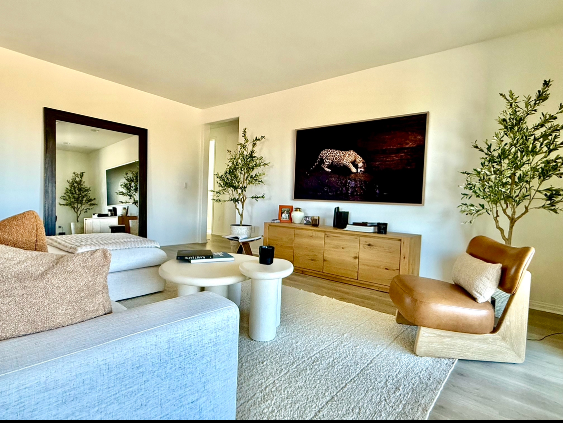 In the den, a custom white oak pool table by Olhausen stands as both a centerpiece and a conversation starter, while four Samsung Frame TVs turn each living area into an ever-changing art installation.