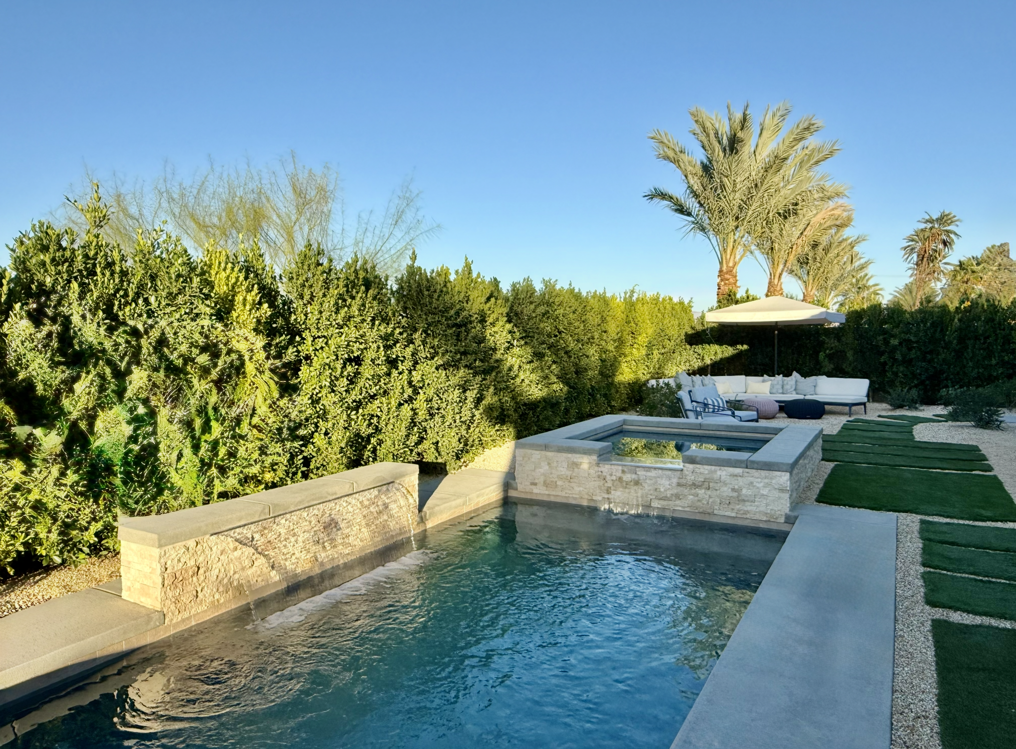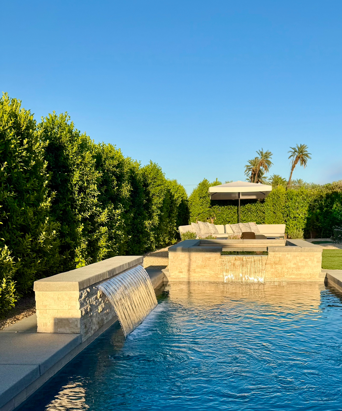 Step outdoors, and the home transforms into a private resort. At its heart lies a custom-designed pool and spa, complete with two softly cascading waterfalls whose gentle sounds carry through the day and into the night, infusing the entire property with a sense of Zen-like tranquility. As twilight falls, the pool glows a rich, luminous blue, casting reflections that shimmer against the stucco walls and swaying palms — a scene that feels transported from a five-star desert resort.