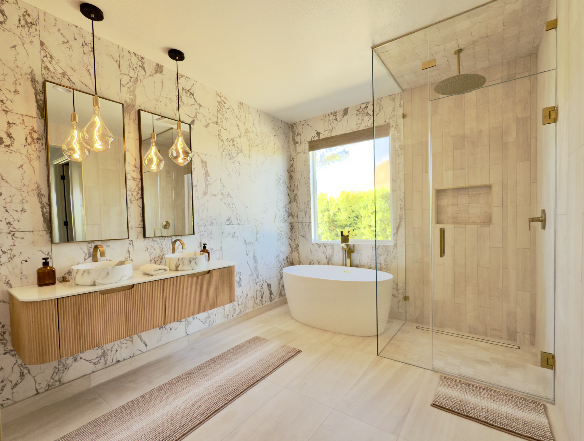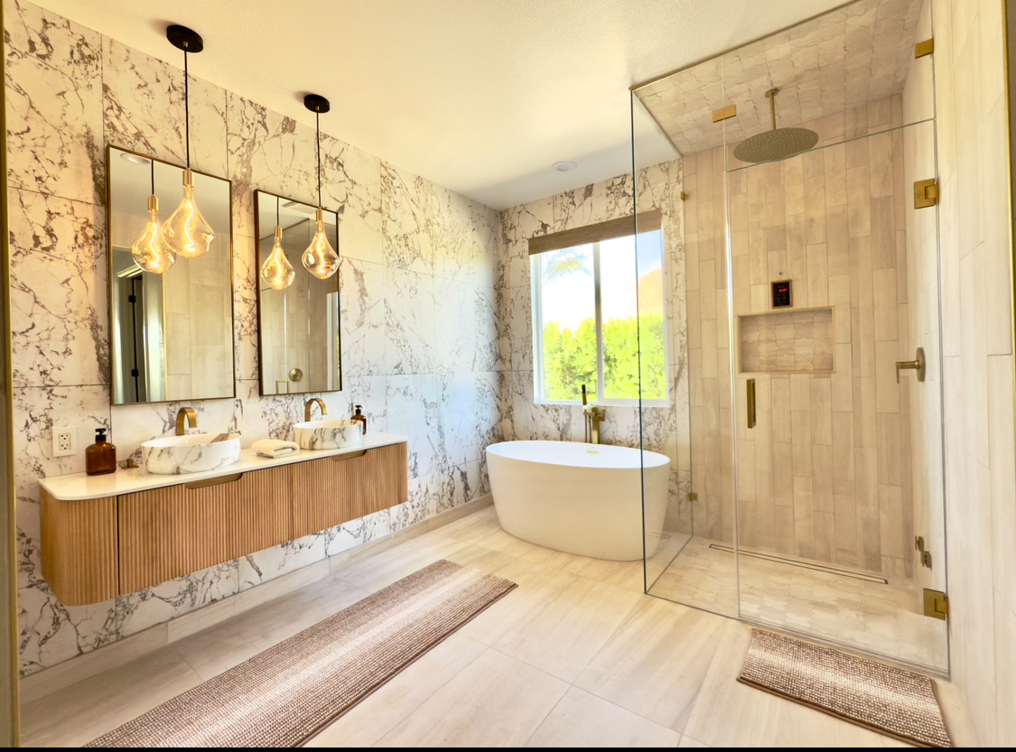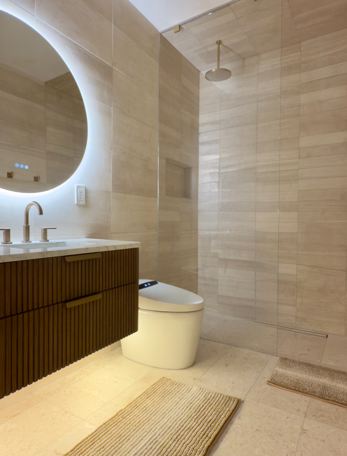 Throughout the residence, three newly remodeled stone bathrooms and a luxurious steam shower in the primary suite blend spa-level indulgence with modern comfort. Every smart heated bidet toilet speaks to the home’s commitment to thoughtful luxury. In the designer kitchen, a built-in Fisher & Paykel refrigerator, custom cabinetry, and breathtaking views of the pool make every moment — from morning coffee to dinner with friends — an aesthetic delight.