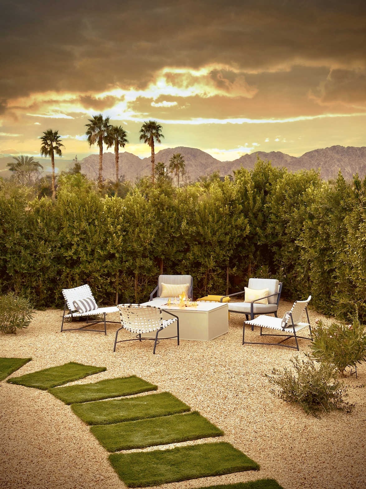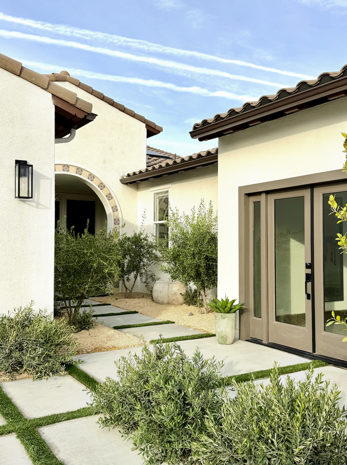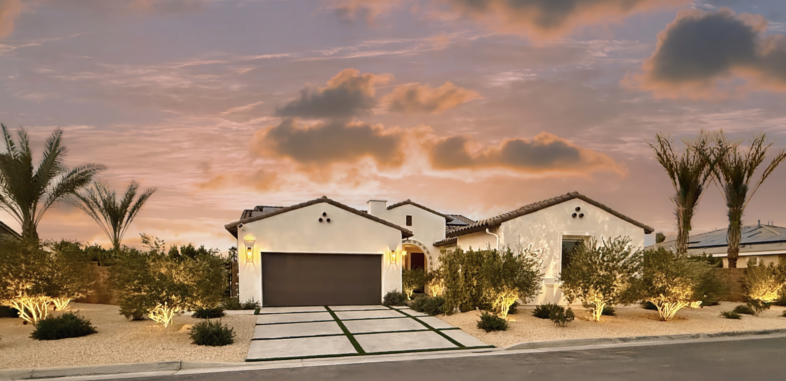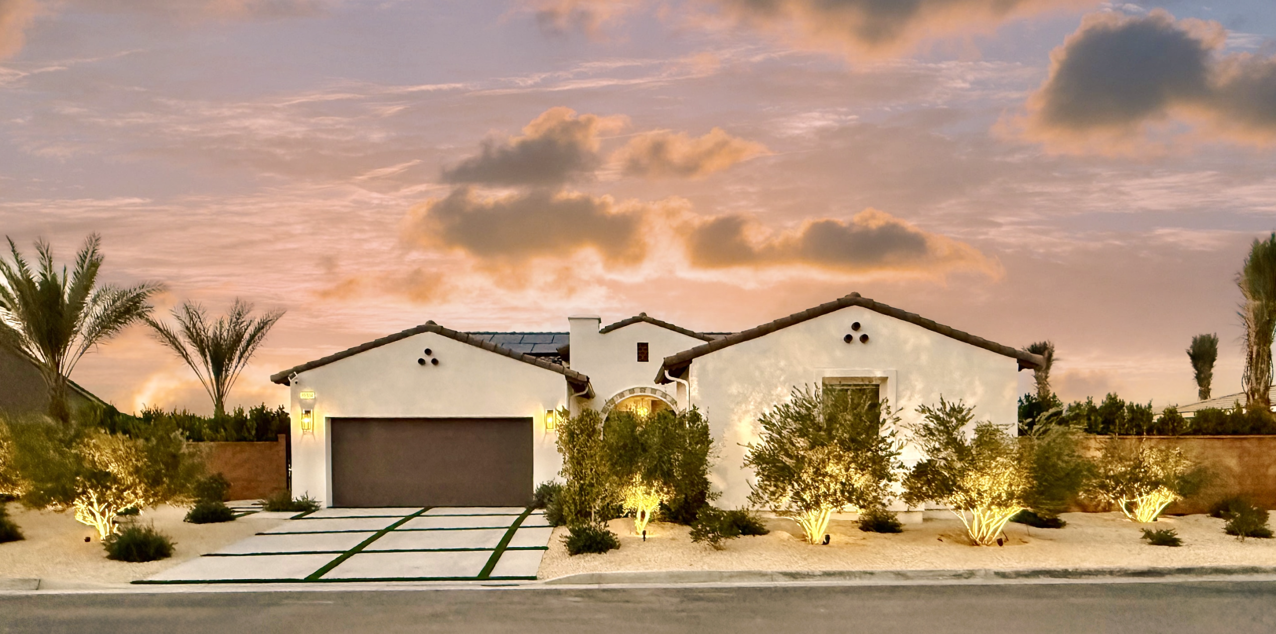 The surrounding grounds are lush and purposeful: twelve mature olive trees frame the landscape, while four large lemon trees and six orange trees infuse the air with citrus fragrance. A custom walking path on each side of the home invites peaceful evening strolls beneath the desert sky, while meticulously designed landscape lighting transforms the property into an ethereal nighttime oasis.